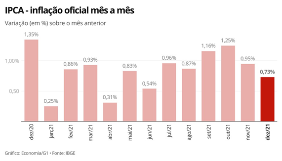 O IPCA de 0,73% em dezembro ficou acima do esperado. A mediana das projeções de 35 instituições financeiras e consultorias ouvidas pelo Valor Data era de um avanço de 0,65%.